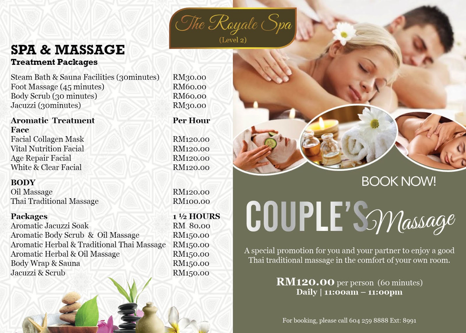 Other treatment packages at The Royale Spa include aromatic facial treatment and foot massage. For hygiene reasons, guests are asked to take a shower before their sessions. Bathrobes and disposable underwear are provided.