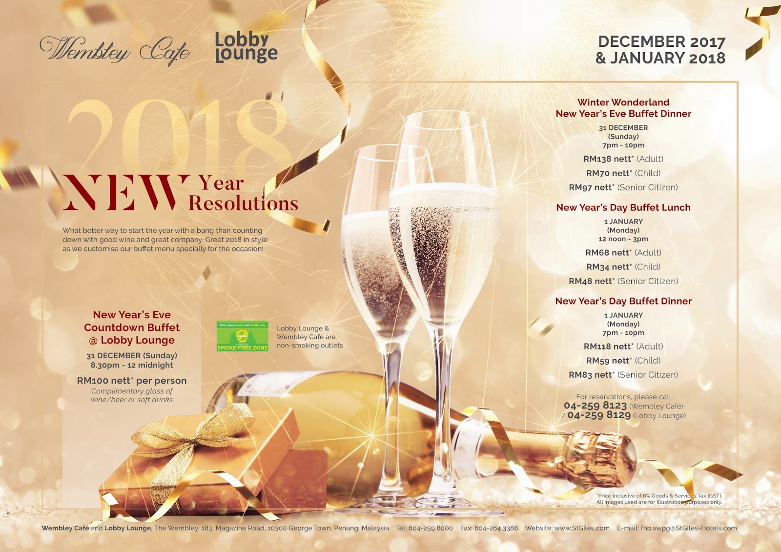 Wembley Cafe offers 4 buffet sessions around Christmas and another 3 more around New Year. In addition to these buffets, the Lobby Lounge is also hosting countdown parties on the evenings of Christmas Eve and New Year’s Eve.