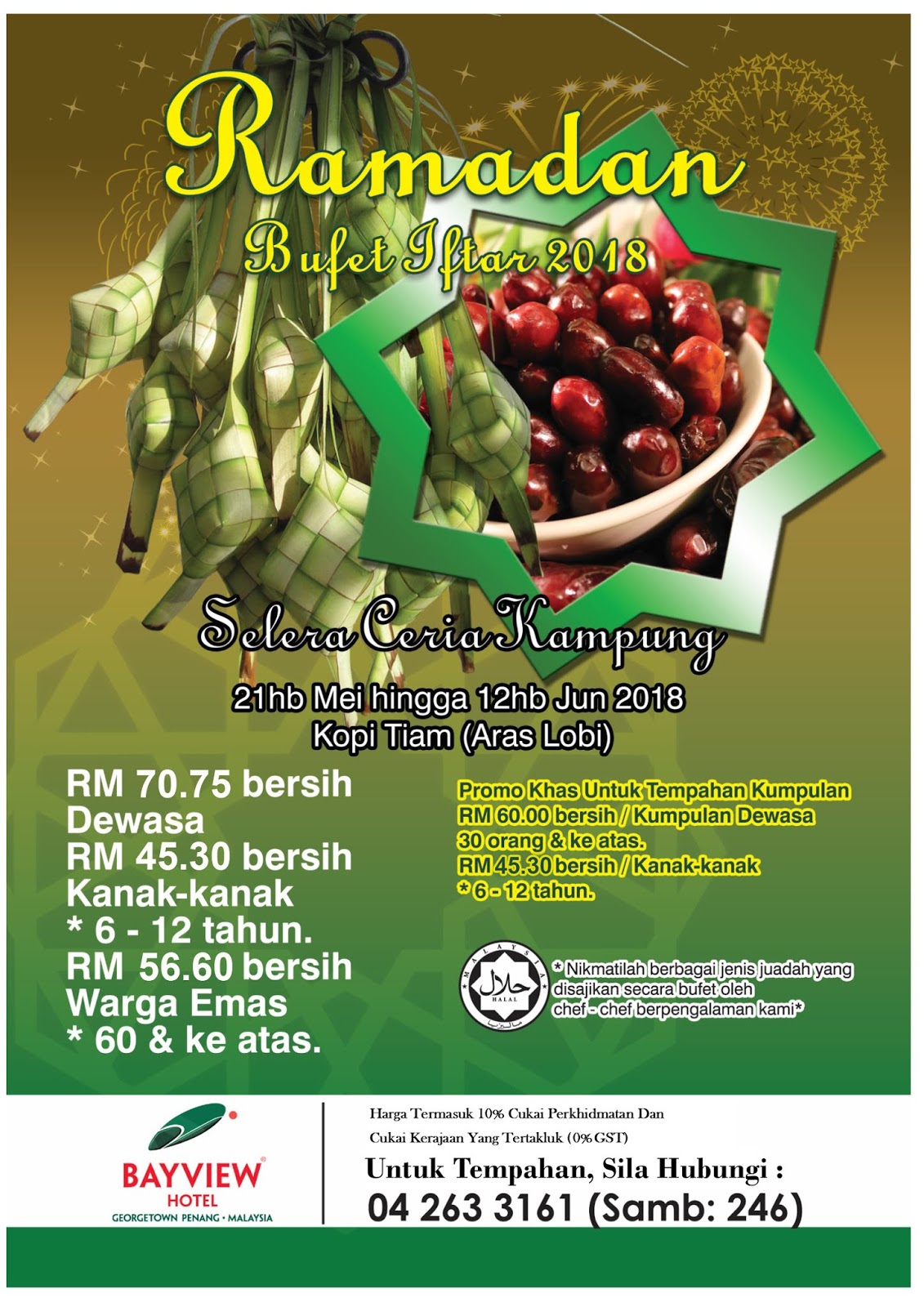 Bayview Hotel serves Ramadan buffet dinner from 21 May 2018 to 12 June 2018. There are 3 menus on daily rotation. Nearly all dishes are changed every day. The buffet is priced at RM70.75 net for adults, RM43.50 net for children (ages 6 to 12) and RM56.60 net for senior citizens (ages 60 and above).
