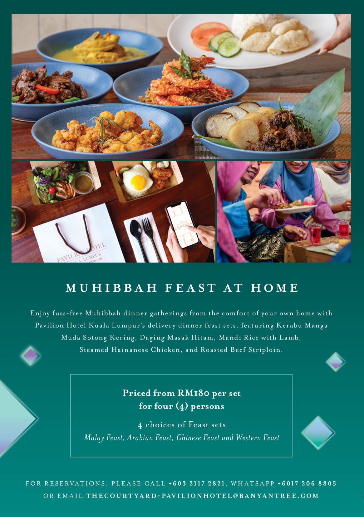 As for customers who prefer to dine in the comfort of their own homes, Pavilion Hotel delivers festive 4-person set meals for RM180.00. Reservation can be made by phone